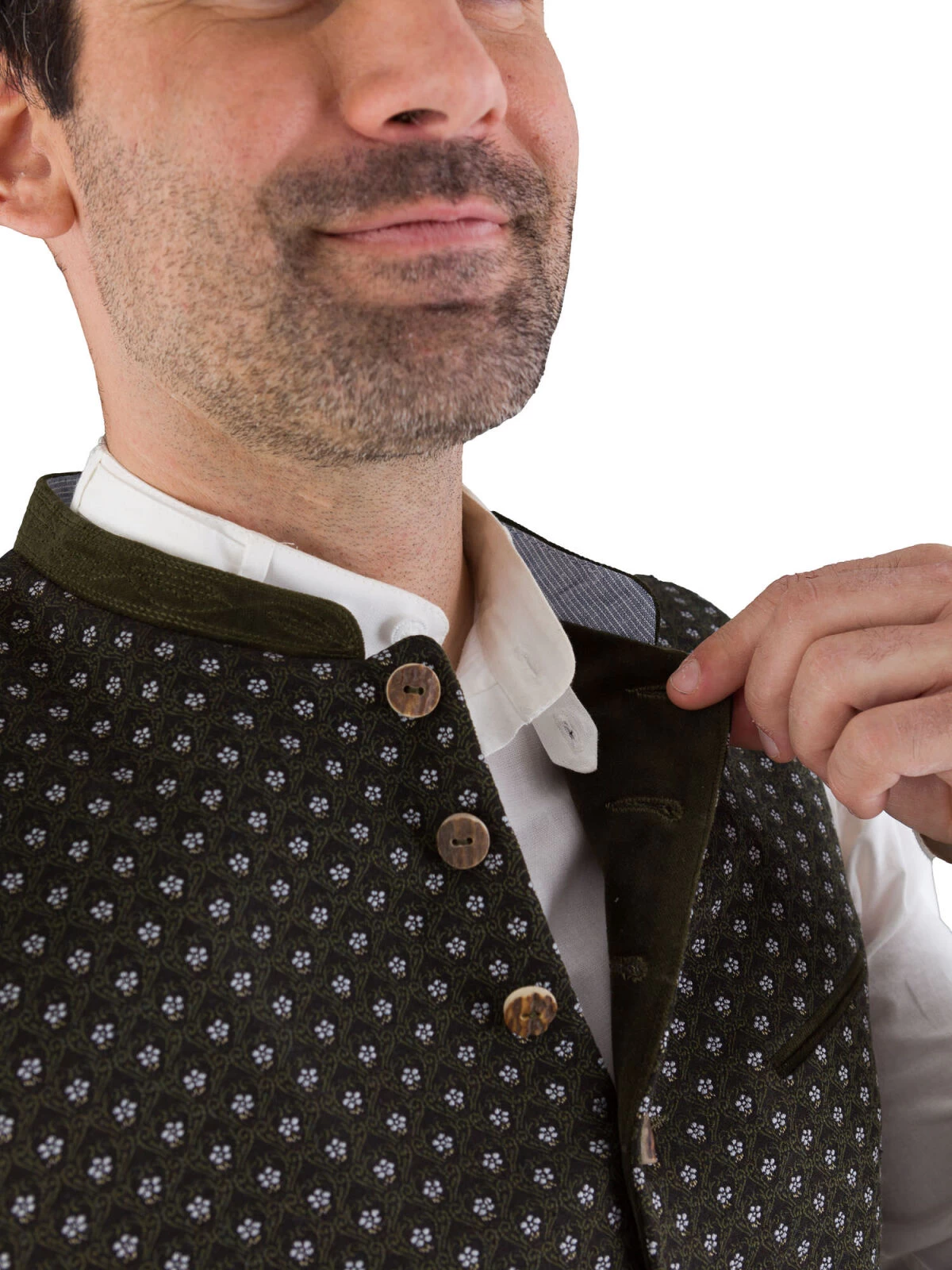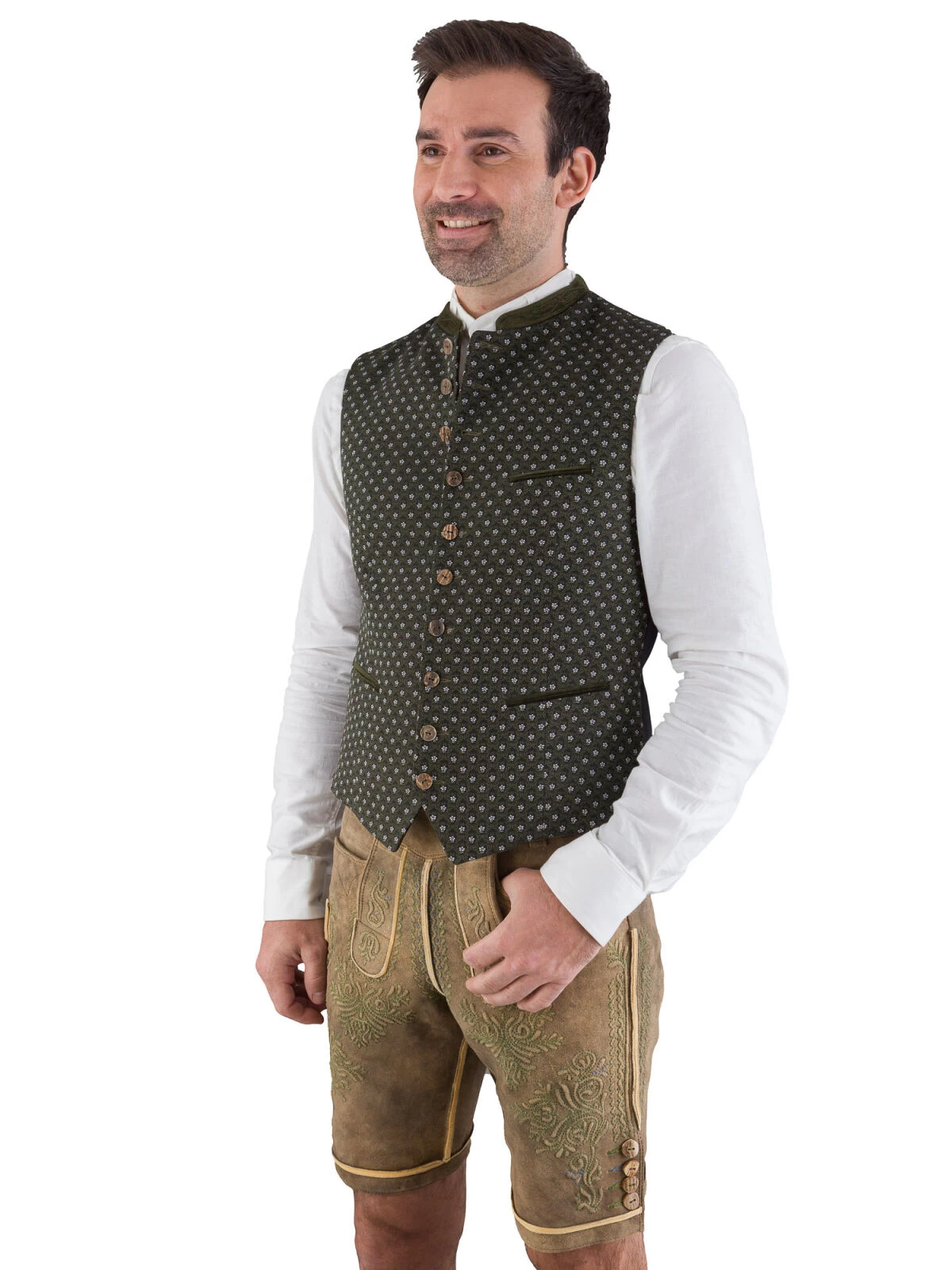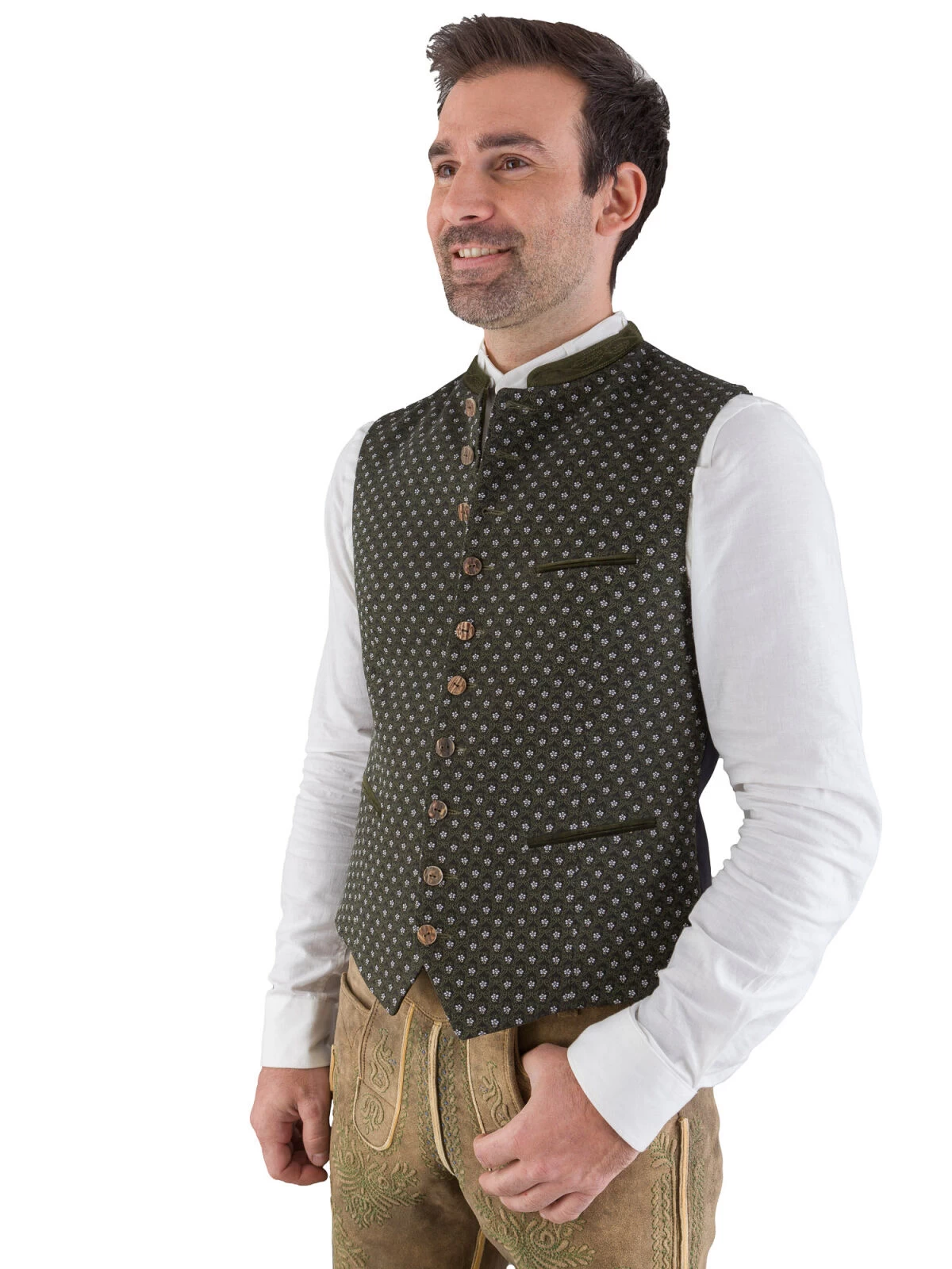 Edle Trachtenweste A00817 flaschengrün mit hellem Blumenmuster im antaillierten schmalen Schnitt von Gottseidank. Das Modell besticht durch die traditionelle Aufmachung, welche durch die echten Hirschhornknöpfe und den besticken Samtkragen unterstrichen wird. Die Taschenpaspele und der Besatz ist ebenfalls aus dem edlen flaschengrünem Samt gefertigt. Der schwarze Stretchrücken ist in sich gemustert und sorgt für eine perfekte und bequeme Paßform. Das gestreifte Futter ist ebenfalls mit Elasthan versehen. Das Gile ist mit 3 Aussentaschen und 1 Innentasche mit Knopf versehen.