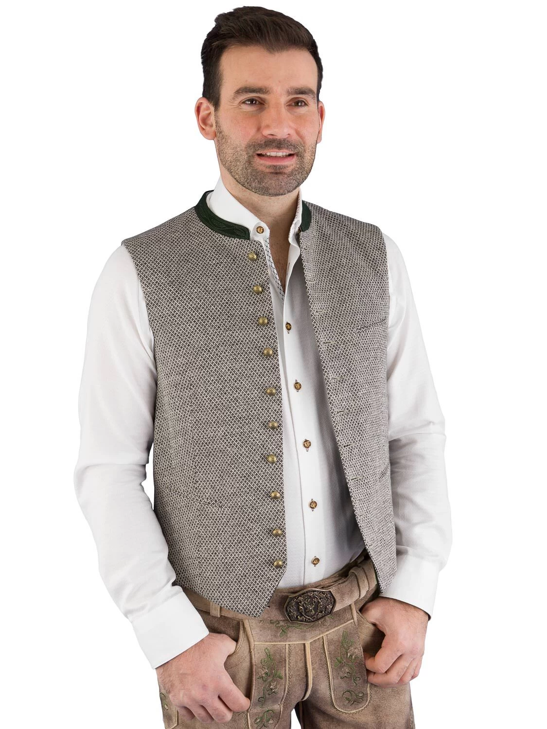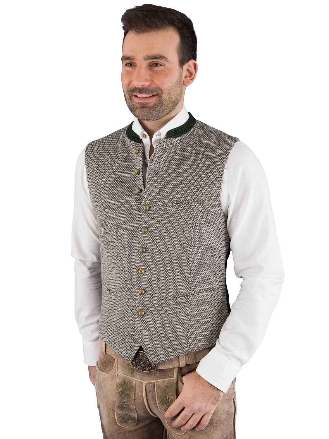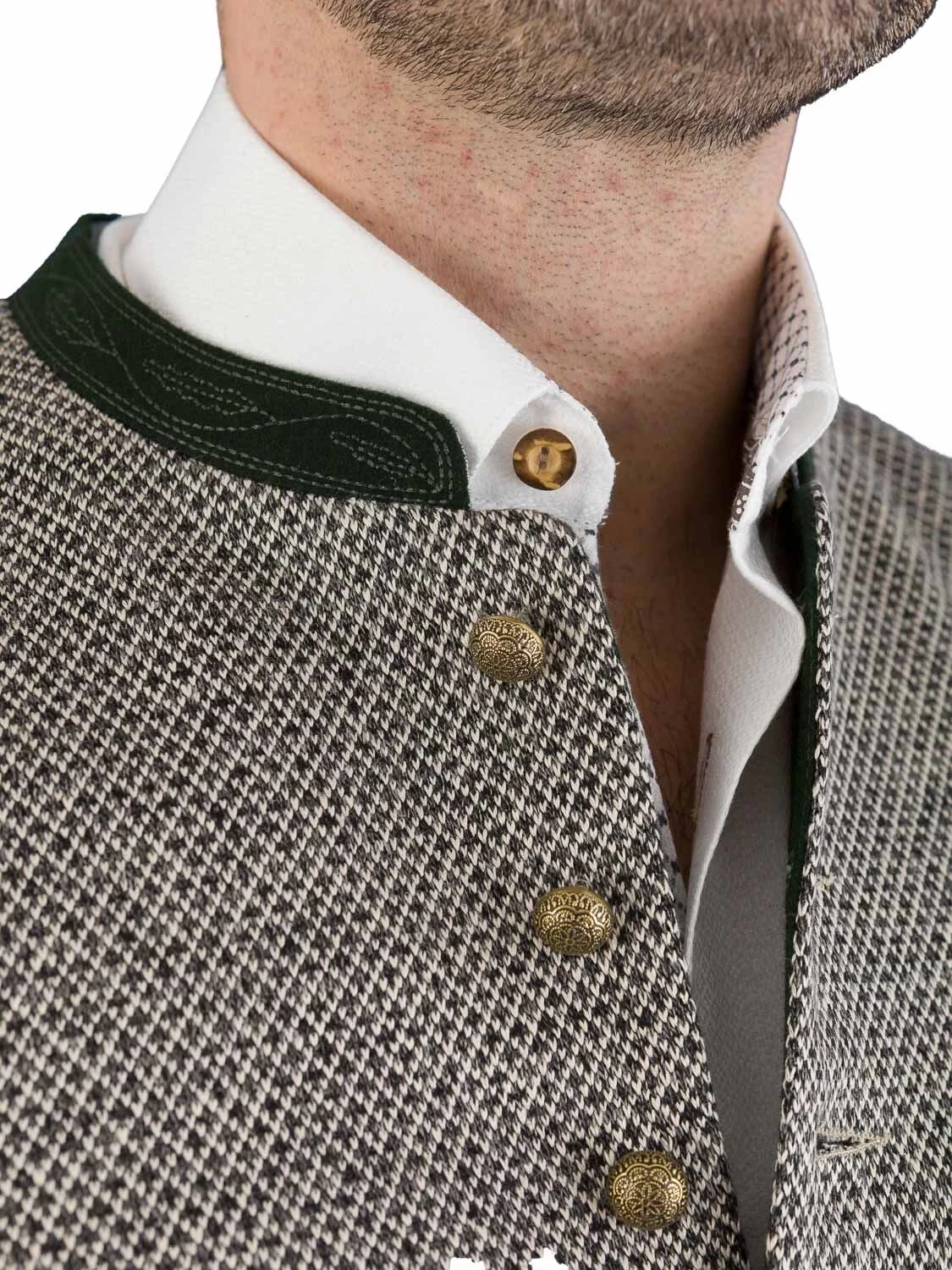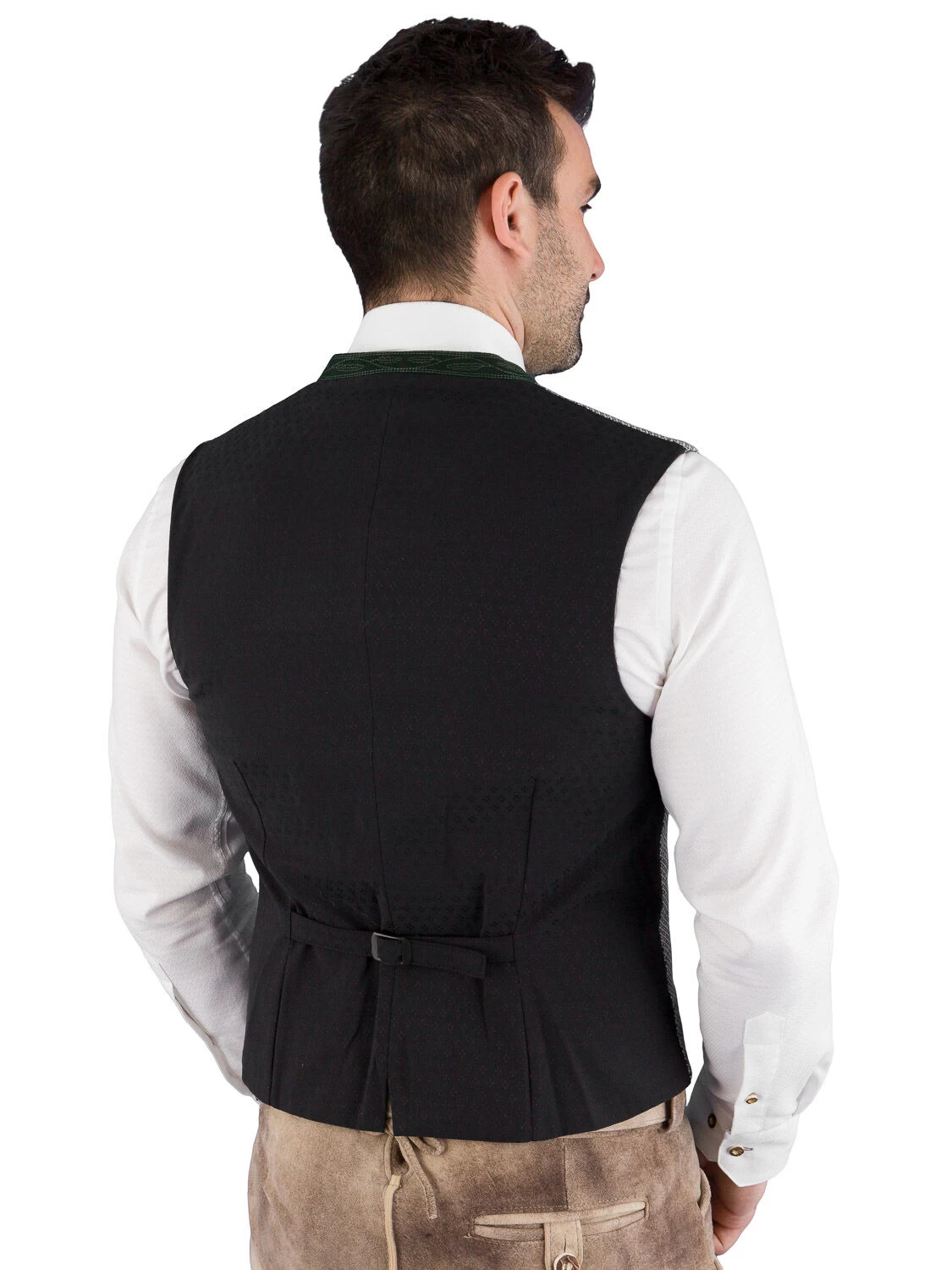 Hochwerte Trachtenwestet Modell KonstantinST in der Farbe ebenholz. Die Weste vom Markenlabel GOTTSEIDANK ist mit einem grünen, dezent bestickten 2 cm hohen Lodenkragen ausgestattet. Der grüne Loden findet sich auch am Innenbesatz und dem Paspel der Innentasche wieder. Der Stehkragen innen ist mit einem blau gestreiften Baumwollstoff ausgearbeitet. Der elegange Rücken aus Stretch besteht aus einem schwarzen Stoff mit eingewebten Rautenmuster. Am Rücken befindet sich eine Spange, um die Taillenweite zu regulieren.